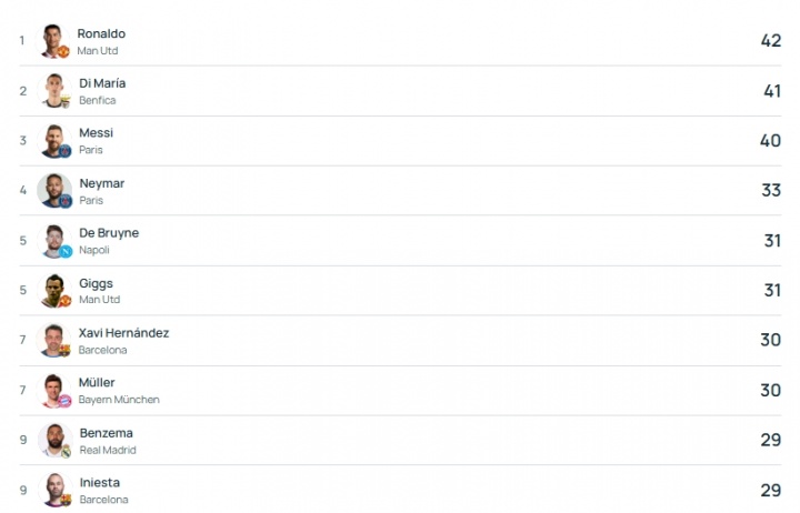 欧冠历史助攻榜前十(数据来自欧冠官网)