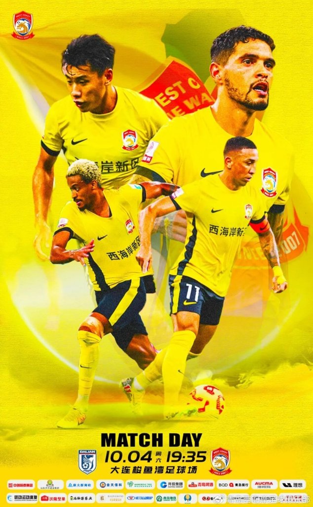 青岛西海岸替补:26-王晗懿、6-徐彬、13-宋浩宇、14-冯刚、19-丁海峰、20-何龙海、21-木塔力甫、30-刘小龙、36-孙捷、39-刘柏杨、56-高迪、68-栾昊